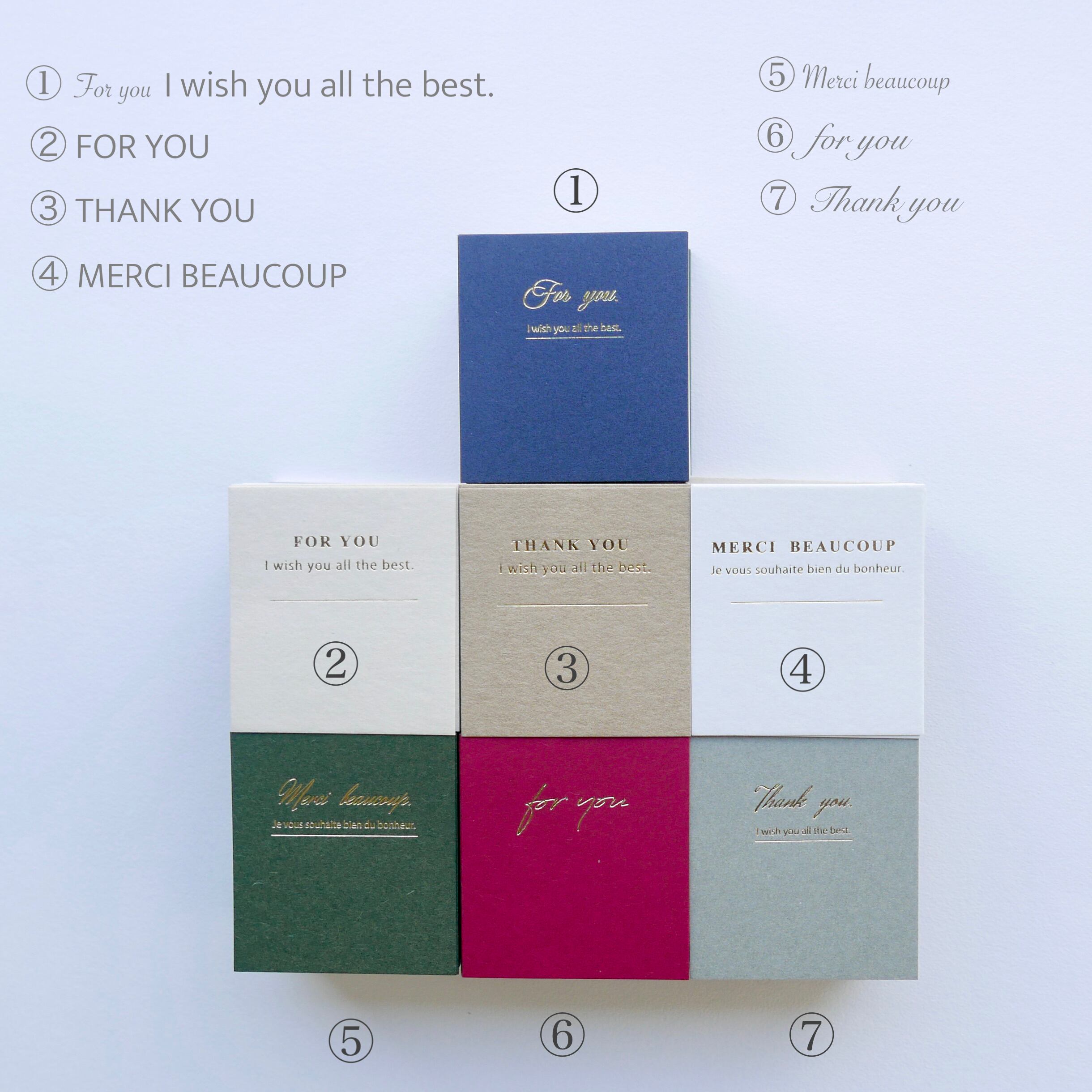 デザイン : ① For you I wish you all the best. ② FOR YOU ③ THANK YOU ④ MERCI BEAUCOUP